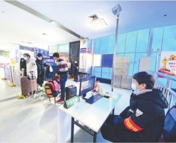 进入车站过安检时,红外测温仪对每一位旅客进行测温,一旁的工作人员时时紧盯屏幕上的温度显示。在人工售票区,地面上标注着一米间隔的黄色提示线,旁边有志愿者进行引导,提醒旅客戴好口罩、保持间隔。