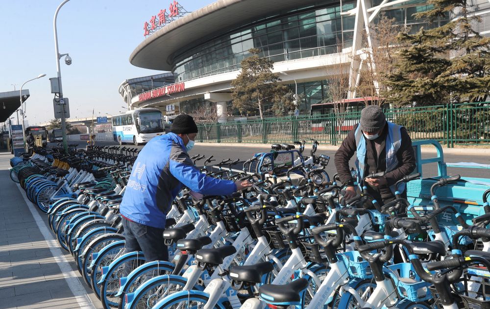 在北京南站南广场外的道路上,一排排不同品牌的共享单车整齐码放在人行步道上的固定停放区内,运维人员正在实施不分品牌的“无差别消毒”工作。在2021年春运前期,北京南站地区城管执法大队加强了对地区内共享单车停放秩序的治理力度,并联合各家企业实现了区域内共享单车的“统一运维”、“统一消毒”。