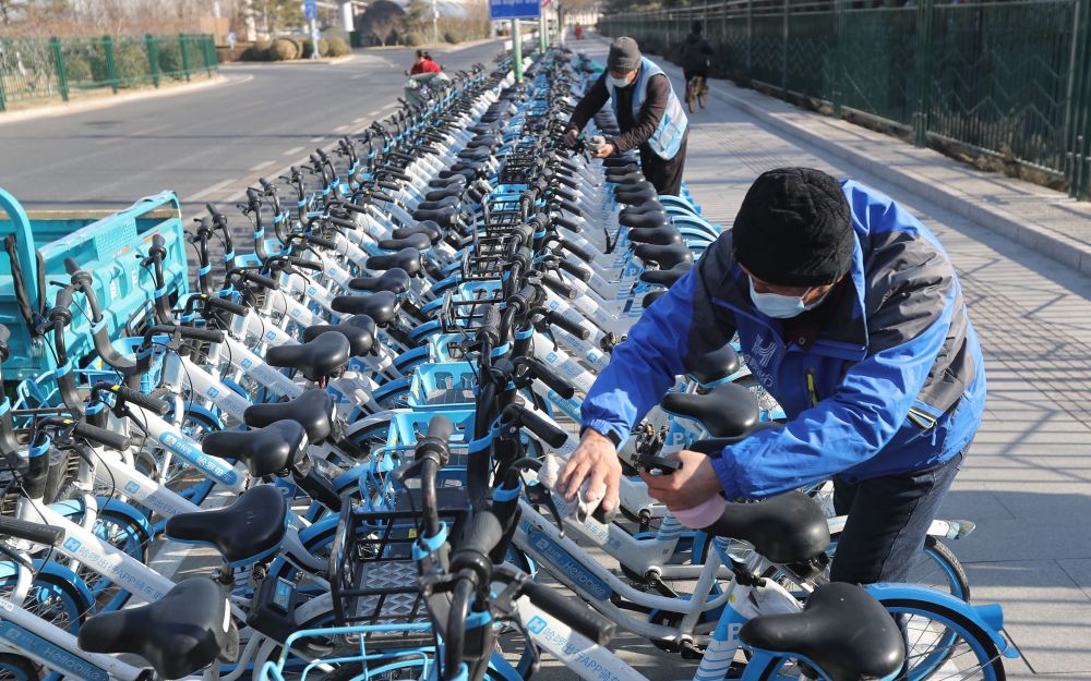 在北京南站南广场外的道路上,一排排共享单车整齐码放在人行步道上的固定停放区内,共享单车企业的运维人员正在实施不分品牌的“无差别消毒”工作。
