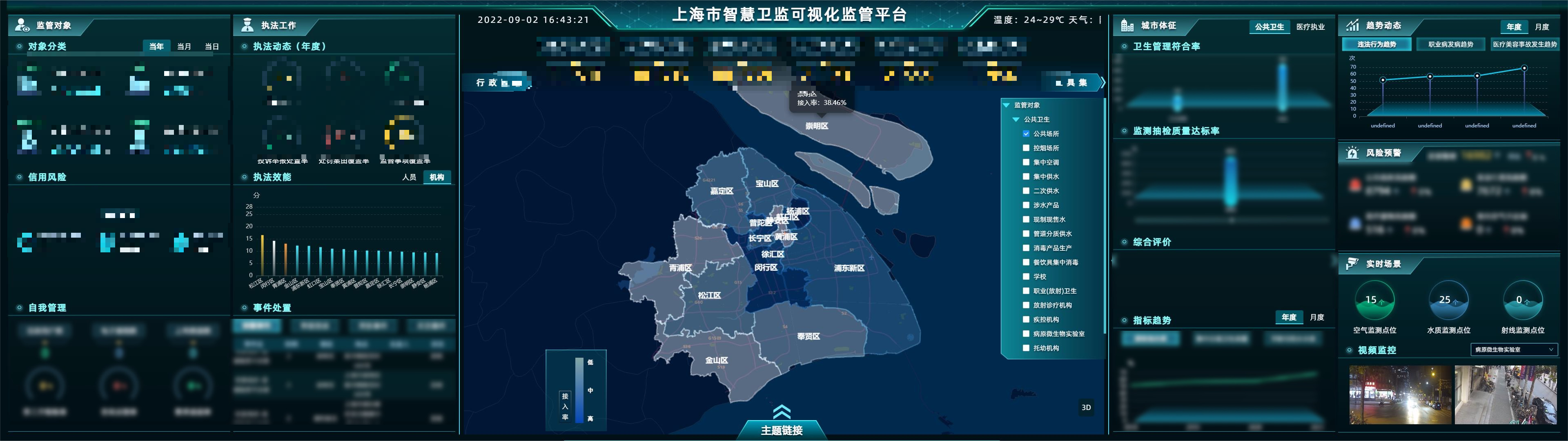 目前,上海统一的卫生监督可视化监管指挥平台已经建成,这一平台搭建了总观屏,通过可视化监管平台,联通监督员手持的移动执法终端和执法记录仪,可以实现指挥中心对执法场景信息状况的即时调取,形成执法现场与指挥中心的协同联动。同时,该平台还可实时反映全市监督执法工作的整体情况。