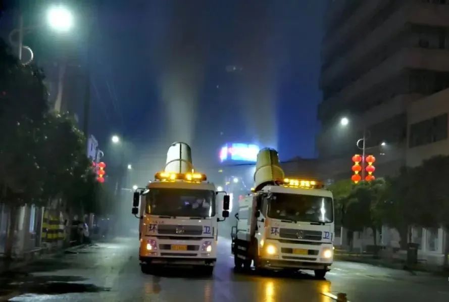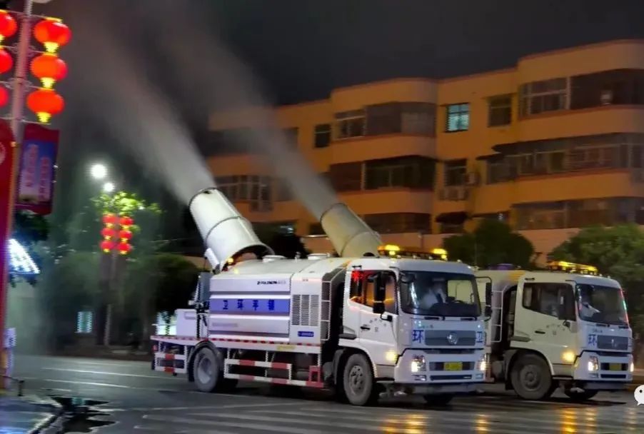 9点整,装载着消毒液的2台雾炮车开始穿梭在镇平县城重点主次干道上,通过它的“大炮筒”,对城区进行雾化喷洒消毒作业。
