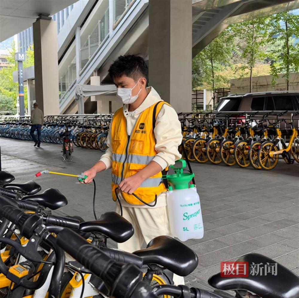 10月26日,美团单车江岸区运维员蔡昌喜随身携带消杀设备,重点针对车辆把手、座椅等部位喷洒消杀,“我们近日会增加车辆消杀的频次,让市民出行更安全。”据了解,美团单车运维团队在车辆的出库、入库、调运等环节实施全面消杀;在景区、商圈、写字楼等热点区域,每天早晚定时进行重点消杀;安排专人在中高风险地区开展高频无差别消杀,全力维护市民安全和身体健康。